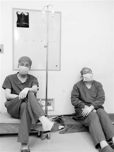 近日,一张两名医生在手术间隙输液的照片走红网络。该照片是西安交大二附院麻醉科主任吕建瑞医生在2018年1月14日下午3时许,经过手术室时所拍摄的,当天两位医生手术任务重,便利用手术间歇时间输液以缓解自己身体不适。记者对话了该照片的当事人,他们表示“病不等人”,“打点滴是为了调整自己的状态”。(1月15日《法制晚报》)