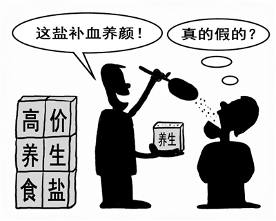 记者在走访南宁市场过程中发现,不少高价食盐都添加了许多微量元素,如主打补血养颜的红枣盐、枸杞盐等。这些主打养生的食盐对于人体健康真的有帮助吗?有专家指出,高价食盐和普通食盐其实没差别,靠食盐来进行养生既不靠谱也不合理,盐吃多了还会对身体产生不良影响。(1月24日《检察日报》)□赵顺清
