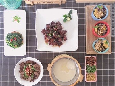 姜楠说,喜欢烹饪是因家族中的长辈们皆有所好。在家乡,父母承包经营了一片山林,其他人家圈养的鸡、鸭、猪,在老姜家都是散养状态,现吃现宰,菜品活色生香。年底的“杀猪菜”更是透着十足的年味。“这几年,我家的年夜饭我都参与。我与叔叔各自承包一桌。他以大盆的炖排骨、酱猪蹄、酱牛肉为主菜。我这边是以蔬菜和精致甜品为主。”