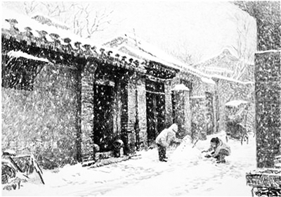 老北京每到冬天给人的印象是一片萧瑟的感觉,冬天的深宅大院少了杨柳翠绿的柔顺,却多了松柏苍劲的风骨。 胡同里偶尔也会有“萝卜赛梨”、“大柿子涩了换咧”……的吆喝,也有谚语“腊七,腊八,冻死寒鸦儿;腊八,腊九,冻死小狗;腊九,腊十,冻死小人儿……”留下了“猫冬”的说法,“冬前冬后,冻裂石头”地面上会出现裂口,用手去拉门把手“刺啦”一下就会粘下一层皮,每当入冬之前各家各户最忙活的就是安烟筒、搪炉子、装风斗,买煤球,储存大白菜、做棉衣棉鞋等事。