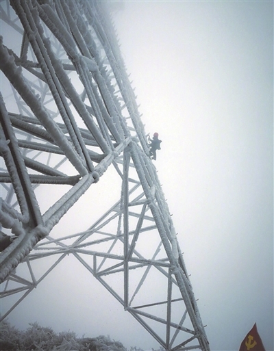 近日,受低温和雨雪天气影响,贵州遵义一输电设备被冰雪覆盖。当地电网公司输电运行检修分公司员工陈长生,爬上220千伏的铁塔,边敲冰、边安装融冰短接线。天寒地冻,让人感动不已。