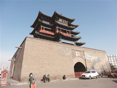 从清远楼正上方向下看,由7.5米高青瓦堆积的底座上,高17米的楼身很像十字形的建筑物。楼台底座开有东西南北四个左右对称的拱形城门。南与昌平、北与广灵、东与安定、西与大新四门通衡。由于地处宣化古城中心,这里的路都是呈放射状展开。虽然维修的时间有几十年了,不少地方墙面脱落,还有小商贩在这里摆摊设点,使得周边环境有些凌乱,但这座古楼还是值得从不同角度去欣赏。