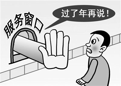 几天前,小周来到西部某市的一所创业服务中心咨询创业贷款政策,没承想碰了一鼻子灰。“现在申请贴息贷款,年前肯定办不下来!”一名工作人员有些不耐烦,“年后再来吧!”临近年关,部分工作人员的“年前综合征”开始发作:还没到假期,状态却已“放假”,经常把“过了年再说”挂嘴上,让办事群众心里添堵。(2月4日《人民日报》)