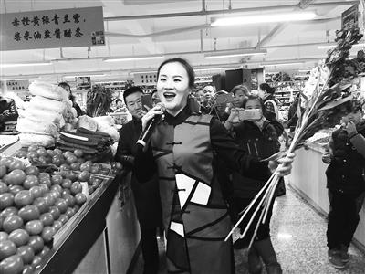 1月31日下午,在北京鑫京热电器有限公司所属的朝内南小街菜市场里突然传来“大青椒、嫩扁豆,水灵灵的葡萄雪里红……”的歌声,这首男女声对唱的《北京叫卖声》,以其京腔京味的唱腔吸引了商户和顾客的注意。原来这是朝阳门街道总工会携辖区楚博霖文化传媒文艺家小分队,为上百位商户和顾客奉献的一场接地气、暖人心的文艺演出。