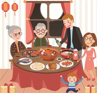 年夜饭又称团圆饭。大年三十晚上,一家人相聚,儿孙们簇拥着长辈,共聚晚餐。年夜饭集中体现了中华民族的三个重要文化元素。一是团圆。一家人围坐在饭桌上,其乐融融。二是喜庆。畅谈一年来的收获和取得的进步。三是展望新的一年,有什么打算,有什么目标以及大人们对孩子的期望与祝福。一家人把酒言欢,边吃边聊。等到零点钟声一响,小孩子们便依次给长辈拜年,长辈则拿出事先准备好的压岁钱赏给小孩子,引得满堂欢声笑语。