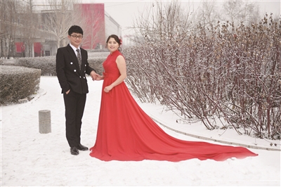 最近一场小雪过后,气温达到-16℃,长春一对新人来到雪地中拍摄婚纱照,鲜红的婚纱和白雪相呼应构成一道美丽的风景线。两位新人都是土生土长的长春人,想在雪地中拍摄一组独特的婚纱照,为自己留下美好的回忆。