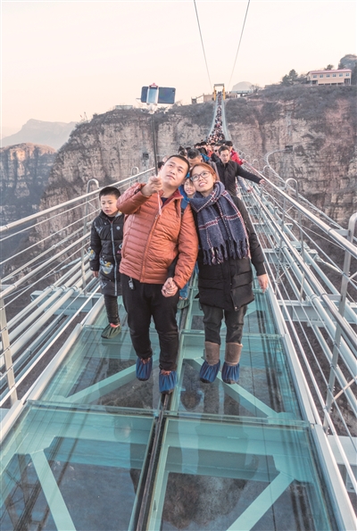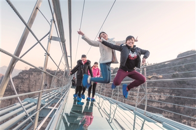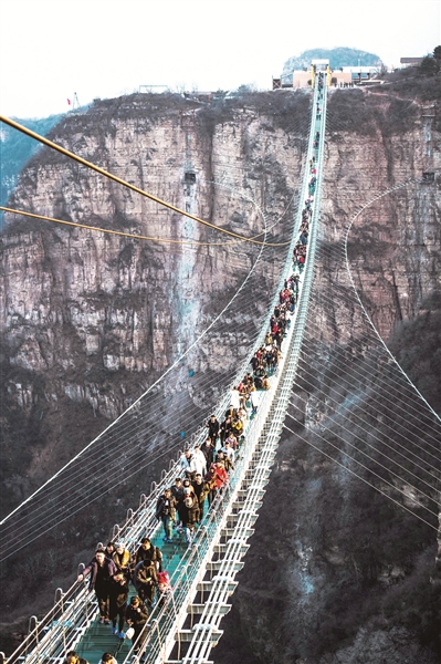 日前,记者首次探访了距离北京360公里与距离石家庄不足100公里,位于河北省石家庄平山县板山村的红崖谷高空玻璃吊桥。红崖谷玻璃吊桥横架两座山峰之间,全长488米,宽4米,桥面与地面垂直落差约218米,相当于站在66层高楼,是目前世界最长、跨度最大的悬空式玻璃吊桥。