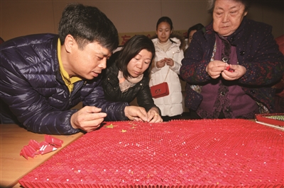 今年四十多岁的刘建军,是燕山石化的一名职工。废旧杂志封面在他手里变废为宝,变成一件件精美的手工艺品,在场的人无不发出惊叹,都跃跃欲试想动手尝试一下。在刘建军的指导下,大家手里拿着已经剪好的只有名片大小的旧杂志封面纸,开始学着制作五星红旗三角折纸的单件。党员们听说这次要制作的作品是五星红旗时特别兴奋。小小的三角折纸单件在大家的手中,一个一个的拼接成了一面鲜艳的五星红旗,在拼接完成的那一刻,大家无比的兴奋和自豪。