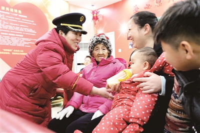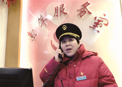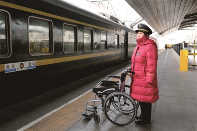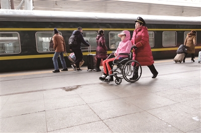 送走牛颖,李素萍立即赶往另一个站台,去接一位从南京到北京的姓毕的残疾旅客。她手扶轮椅直立眺望,在大风中等候着即将进站的列车……春运期间,李素萍和她的同事们每天都这样忙碌着。