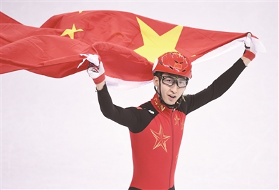 2月22日,在江陵冰上运动场举行的2018年平昌冬奥会短道速滑男子500米决赛中,中国选手武大靖夺冠,这是中国代表团在本届冬奥会上的首枚金牌。图为武大靖庆祝胜利。 新华社发