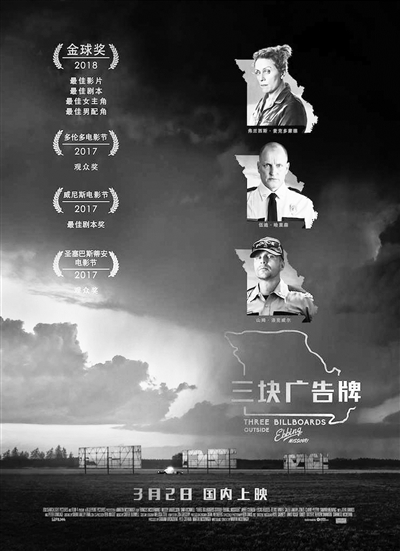 由马丁·麦克唐纳执导,弗兰西斯·麦克多蒙德、伍迪·哈里森、山姆·洛克威尔等人领衔主演的电影《三块广告牌》,讲述了米尔德丽德海斯在女儿惨遭杀害,而警方迟迟未能破案时,绝望悲伤的她租下了公路边上的三块巨型广告牌,在上面控诉警方办案无能。这三块广告牌,在小镇上引起了轩然大波……