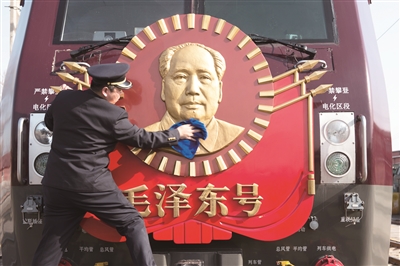 班前会上,刘钰峰照例将安全细节与注意事项与班组成员一一交待。随后,检修、擦车,他出发前必做的工作在大年初一这一天显得格外有意义。照一照阴影处的设备,紧一紧列车底部的零件,他把乘客的安全落实在上车之前;车头的毛主席像擦得亮堂堂,车厢也在阳光照射下干净清爽。即便是在家,刘钰峰一样对毛泽东号“爱不释手”。他有一部第一代毛泽东号机车的模型,在家的时候,经常会擦拭观摩。