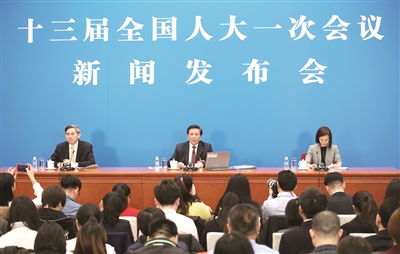 3月4日,十三届全国人大一次会议在北京人民大会堂举行新闻发布会。大会发言人张业遂就大会议程和人大工作相关的问题回答中外记者的提问。(相关报道详见第3版)新华社发