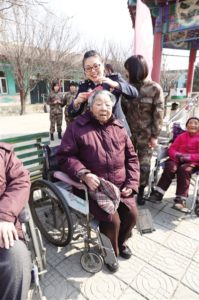 “闺女,你唱的可真好听!这些歌我们都爱听!”离陈默最近的王奶奶表示,好久都没听到过这么亲切的歌声,就像回到了过去。陈默蹲下身子,握起轮椅上王奶奶的手,把老人家的饮食起居状况问了个遍。随后,她看到老人稀疏的牙齿和略微凌乱的白发,便找来梳子为老人梳起了头。下午的阳光安静地洒在二人身上,宛如一幅生动的油画。“闺女,谢谢你,年轻的时候,我自己也经常梳头打扮,可现在老了,梳不动了。”“老妈妈您放心,以后我会常来给您梳头!”