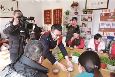 当陈默和队友们享受在孝亲敬老的幸福中的同时,服务队的另一组人马,也成功和地税的志愿服务队“会师”,到达了玉桥街道残疾人温馨家园。这里的30多名残障人士多为智力障碍,个别存在肢体残疾。为帮助他们早日康复,志愿者们精心准备了节目。第一次来到残疾人关爱救助单位的通州国税局团委书记权泉表示,这些残障人士,和他预想的状态很不一样。“我原本以为这些人生活困难、单一,状态颓废,可当我见到他们后,却看到屋里摆放着好多他们亲自种植的花草和编织的手工艺品,发现他们也在做着力所能及的事情,让我更加坚定了帮助他们的决心。”