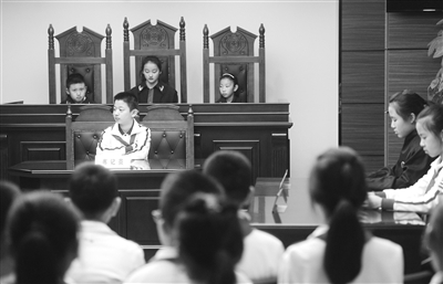 26日,板厂小学的学生通过青少年模拟法庭直观感受到了民事案件的审理过程。模拟法庭上,由小学生组成了法官和书记员,以及原、被告和代理人。此次活动是由龙潭街道“七五”普法办公室组织,通过活动让学生增强法律意识和法治观念。本报记者 于佳 摄影报道