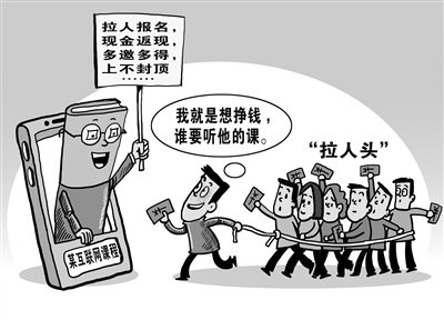 近日,“新世相”课程营销事件引发广泛关注。19日上午,不少人的微信朋友圈被一张互联网课程的海报刷屏。海报上,北京世相科技文化有限公司CEO的营销课程被标以9.9元的价格销售。3个多小时后,微信平台封停了该海报上的二维码,随后,不少购买者要求主办方退款。20日11时许,“新世相”称网友可在相关微信公众号申请退款。疯狂刷屏的网课购买,究竟是成功的营销还是违法的传销?“知识付费”如何在营销炒作与传道授业之间找到平衡点?(3月27日新华社)