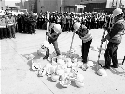 “劣质安全帽一顶都不能进入施工现场,对于提供这些安全帽的劳务队我们也要加强教育,不配合整改的坚决清退,要牢固树立安全至上的理念。”随着中建三局北京公司安全总监牛慧斌大手一挥,38顶劣质安全帽被当场敲碎,而执行者正是佩戴这些安全帽的工友。3月27日,一场砸碎“坏帽子”的安全维权活动在中建三局北京公司张北万国数据中心项目上演。