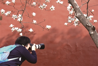 近日,随着气温的不断回升,北京街头的各种花卉陆续开放,吸引众多市民纷纷走出户外,踏青赏花。图为游客在长安街拍摄红墙前的玉兰花。