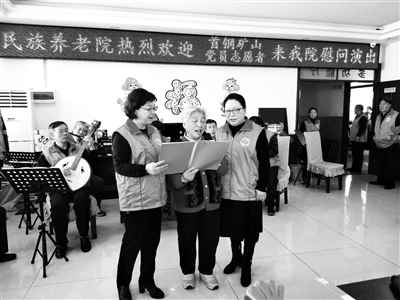 上周,首钢矿山街道十余名党员志愿者先后赴石景山区民族养老院、老年福敬老院、海航国际颐养社区3个养老院进行慰问。作为首都劳动奖章获得者,矿山街委党委书记、主任安丽娟带领党员志愿者利用双休日,为老人表演节目,包括戏曲、合唱、诗朗诵等,所有节目都是志愿者自编自导自演。