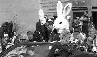 4月1日,在加拿大多伦多,“复活节兔子”在游行中向观众挥手。当日,加拿大多伦多举行一年一度的复活节游行。 新华社发