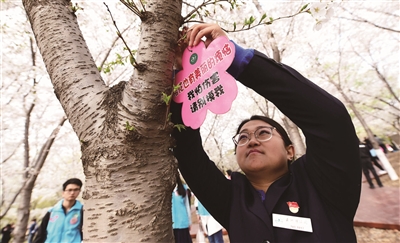 侯翠卓是玉渊潭公园志愿者负责人,一大早,她就开始为志愿者进行岗前培训,讲解樱花树种的习性。“樱花并不太适应北京的气候环境及土壤,生长量较小,它们在公园经历了十余年的适应和生长,才将美丽绽放在游人面前,希望志愿者能够发自内心理解认同,才能劝阻游客不要在拍照时攀枝折花,损坏美丽的樱花。”