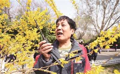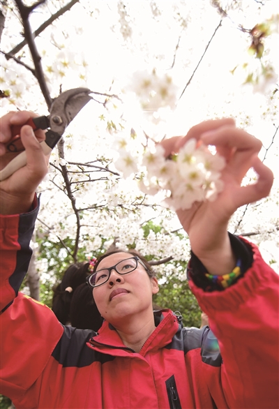 还没开园,公园园艺队工程师姚毅就穿梭在各片儿赏花景点对折断的花枝及时修剪。姚毅介绍说:“随着赏花进入高峰期,游人攀折花木,集中踩踏都会给樱花的生存环境造成极大伤害,我们园艺队职工日常养护主要负责绿地巡视,劝阻摇晃、攀折花木、攀爬树木的不文明行为,及时清理绿地内垃圾,修剪花灌木折枝,剪除地栽花卉残花,保证樱花绿地安全、清洁,为广大游客呈现最美的樱花季。”