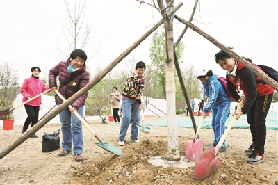 昨天上午,北京奥林匹克森林公园劳动广场内一片热闹景象,来自首都各条战线的150余名劳模代表齐聚于劳模墙前参加植树造林活动。本次“劳动光荣”首都劳模义务植树活动由北京市总工会举办,是首都劳模在全社会大力宣传劳动精神、弘扬劳模精神的实际行动。(相关报道详见第4版)