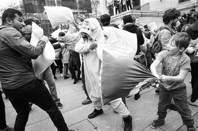 数百名民众4月7日在加拿大温哥华市中心参加“枕头大战”,释放压力,愉悦身心。图为人们在加拿大温哥华参加“枕头大战”。