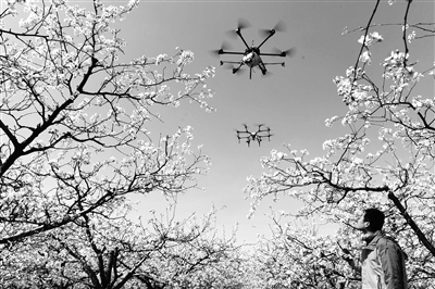 4月9日,在河北省泊头市付村梨园内,工作人员操作无人机为梨花进行液体授粉。 眼下,“鸭梨之乡”河北省泊头市25万亩梨树进入盛花期。当地今年首次采用无人机液体授粉替代人工授粉,日均有20多架无人机在梨园作业,这一新技术的应用大幅提高了授粉效率,节约了劳动力成本。新华社发