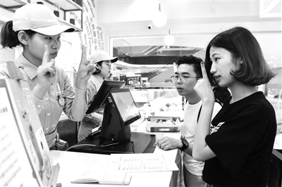 4月14日,广州“无声”面包店的收银员通过手势比划与顾客交流。这家“无声”面包店的收银员、咖啡师、西点师等17名员工均为聋哑人士,他们通过手势、卡片、写字等方式与顾客沟通,在面包店内创造属于自己的价值。(4月15日中新社)