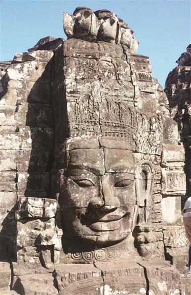 游客在进入大吴哥城都城前远远便会看到,大石城门上面刻着吴哥王朝全盛时期国王加亚巴尔曼七世的面容,唯与印度教不同的是此乃象征眼观四面耳听八方的四面佛。接着进入城中参观有49座巨大四面佛雕像的巴戎庙,佛像为典型高棉人的面容。其中最特殊的设计,是每一座塔的四面都刻有加亚巴尔曼七世的微笑面容,200多个微笑浮现在葱绿的森林中,多变的光线或正或侧、时强时弱地探照,轩昂的眉宇、中稳的鼻梁、热情的厚唇、慈善的气质,国王的微笑反而胜过建筑本身的宏伟,因而被后人尊称为“高棉的微笑”。