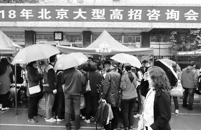 上周末,在北京市第一七一中学,2018年本市首场大型高招咨询会在雨中拉开大幕。近60所本市及外省市高校参加,此外还有相关专家到场为家长答疑。活动中,名校齐聚、专家助阵,让冒雨前来咨询的家长热情不减。本报记者 孙妍 摄影报道