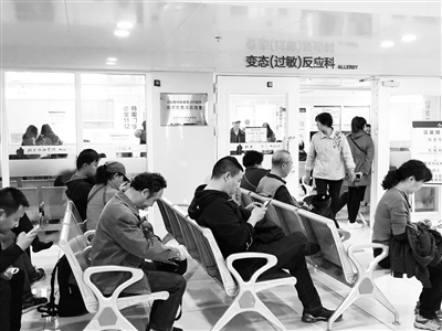 记者昨天在协和医院变态(过敏)反应科看到,在此候诊的患者很多。据医生介绍,春季是过敏高发期,现在每天的就诊量比平日增加3倍,其中花粉是非常常见的一种致敏源,它在皮肤上表现为红斑、脱屑和瘙痒。在此提醒市民,从户外回到室内后,应换掉外套,并用流水洗手洗脸,冲掉皮肤上的花粉。本报记者 孙妍 摄影报道