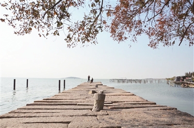 花岗岩铺就的古码头蜿蜒斜向伸入烟波浩渺的太湖,据说在修建码头之前,村民们请风水先生来看风水,一是考虑到明月湾三面环山,朝湖一面亦掩盖于参天古树下,隐秘不易被发现,斜向的码头使远来船只更易发现;二是当年明月湾外出经商的村民多行走于浙江湖州,他们把湖州方向看作明月湾的财神所在地,而湖州入太湖的港口恰好对准了明月湾,为使富水不外泻,码头必须斜造方能聚财纳福。