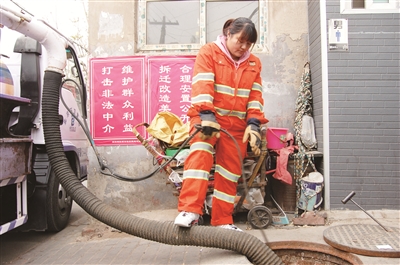 刚开始干时,李萌不会用劲,把重二三十斤的抽粪管子抱上、抱下,腿和肚子都得用上才行。后来她跟老师傅们学才知道,看似简单的工作,技术性还是很强的。二三十斤重的粪管抽满粪就有六七十斤,而且并不是把管子插在粪井里就行,还要抱着管子来回晃动,把粪井里的“漂”,也就是杂物、粪渣抽走。赶上粪管堵住了还得用手把杂物抠出来,要不然就没法干活了。