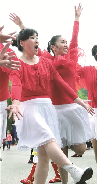 | 在工人体育场广场,职工跳起欢快的健身舞。万玉藻 摄 |