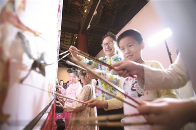 | 在劳动人民文化宫,职工带着孩子一起参加皮影戏表演,体验老北京民俗文化。 |