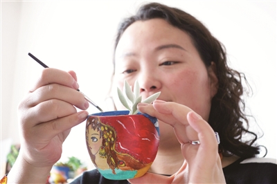 不久后,不满足造景的梁爽还将“多肉”的种植又提升到一个新的平台。“她开始自己给‘多肉’画花盆。”梁爽的同事来自党办的郭洁薇称赞道。“当时,我看到赵姐的‘多肉’花盆都特别漂亮,我就想到自己可不可以画些独一无二的花盆来。”梁爽介绍。