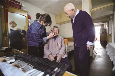 一大早,公交客三分公司工会带着照相馆的工作人员,上门为刘玉华和老伴儿钱元隆拍摄钻石婚纪念照。