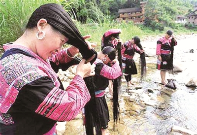 广西黄洛瑶寨已有几千年的历史,村里的女性都以长发为美,从生下来就开始蓄发,到了17岁剪一次头发,像成人礼一样,意味着姑娘长大了可以婚嫁了。潘永燕是黄洛瑶寨土生土长的瑶族姑娘,头发有1.6米长,“我们用淘米水洗头,到80岁也不会有白头发。”