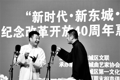 本报讯(记者 边磊)5月11日晚,“新时代·新东城·新相声”——纪念改革开放40周年专场曲艺惠民演出在东城区第一文化馆风尚剧场拉开序幕,活动连演3天,分别是传统节目专场、新作品专场、新人新作专场。