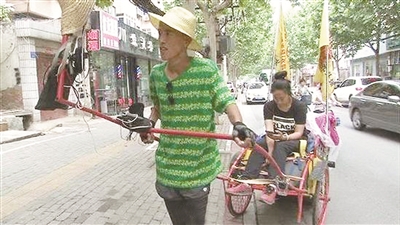 一个小伙子用人力车拉着女友从甘肃老家出发,途经陕西来到河南,想要到山东威海。已经走了 41 天,他说遇到刮风下雨,就找旅馆住宿。追女友追了好多年,这回用车拉着女友去山东看大海,就是为了锻练自己的毅力,看看自己能否坚持下来。另外女友也说过,如果能把她拉到海边,回去就结婚。