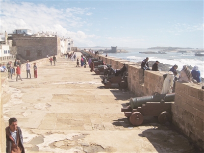 苏维拉在1300年前腓尼基人定居此地,15世纪时由葡萄牙人占领,用于商业交易和军事基地,直到18世纪才被摩洛哥苏丹统治成为海事基地,并建造由城北区沿着海岸往南,约有200米的防御炮台要塞,要塞大道边的1.5米高的围墙下,有20多尊铜制大炮。当天晚餐后我就爬上围墙,欣赏苏维拉的日落,令人心旷神怡。