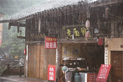 雨下得很大,古镇上空的雨丝却是那样气定神闲地从空中飘落而下,就像织机上的道道丝线,闪着亮光,排着整齐的队伍一股脑地从天而降。不管是街上打着花伞闲庭信步的游客,还是当地身披蓑衣徐徐前行的村民,早已习惯了这不约而至的细雨,任绵绵雅雨打在身上,丝毫没有改变他们的生活节奏。房檐上也早已细流如柱,霹雳啪啦地敲击着地面,就着人们踏雨而过的脚步声,奏汇成一曲雨滴交响曲。坐在雅鱼饭店,慢慢品着清香滑嫩的砂锅雅鱼,欣赏着古镇雅雨绵绵,伴着不时经过的淳朴清秀的雅女背影,真的好惬意。