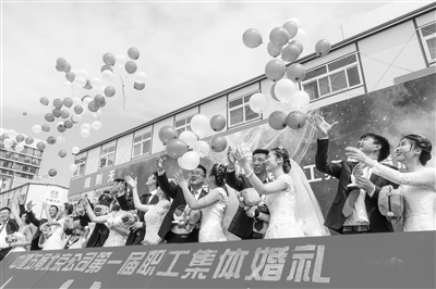 5月18日,中建五局北京公司华夏35#地块项目部响起了温馨的旋律,10对新人缓缓步入婚礼现场。在公司第一届职工集体婚礼上,工会主席李洪运主婚,新人们交换戒指、互赠信物,并携手表示将在工作中尽责、在生活中相爱,努力实现和谐家庭,为公司“转型升级”、做强区域影响力贡献力量。本报记者 邱勇 摄影报道