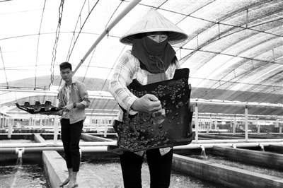 近年来,澳角村陆续建起128家鱼类养殖场,创立各类水产品加工厂38家,产品远销海内外。如今,澳角村民年人均纯收入达5.5万元,许多村民住进了楼房。澳角村民用智慧和双手实现了由传统落后的渔村到现代美丽渔村的华丽蝶变。 图为澳角村一处大型鲍鱼苗养殖场,一位村民在查看鲍鱼苗生长情况(5月10日摄)。