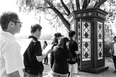 本报讯(记者 邱勇)昨天,记者在北京玉渊潭公园看到,公园西湖畔矗立的央视“朗读亭”前已排了长长的队伍。据介绍,这是央视“朗读亭”在北京首次进驻市属公园。