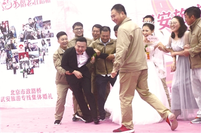 5月19日下午,距离北京500公里之外的河北武安,时紧时缓的细雨并不能阻碍武安旅游专线项目部6对新人的幸福之路。在雨中,他们和集体婚礼的司仪一遍一遍演练着婚礼程序和各自要发表的誓言。