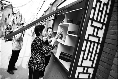 据莲花寺社区工作人员介绍,5月初,社区组织开展了“老物件征集”活动,邀请居民贡献出老物件,用“墙上博物馆”展现社区文化,美化背街小巷环境。通过前期宣传、走访,许多居民纷纷将家中珍藏的“宝贝”送到居委会。为确保每件老物件的身份信息无误,社区请来司法所的工作人员全程参与,现场与捐赠居民签定协议。同时,为了让老物件有个美观的“家”,莲花寺社区在中仓街道办事处的支持下,结合街巷特点,请专人进行整体规划、设计多宝格,并在胡同内安装摄像头实时监控,确保老物件的安全。